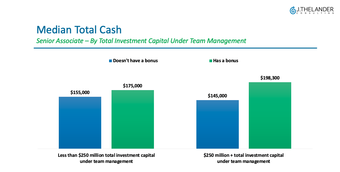 - 75% of senior associates received a bonus regardless of the total investment capital under their team’s management. This percentage increases as investment capital under management increases.