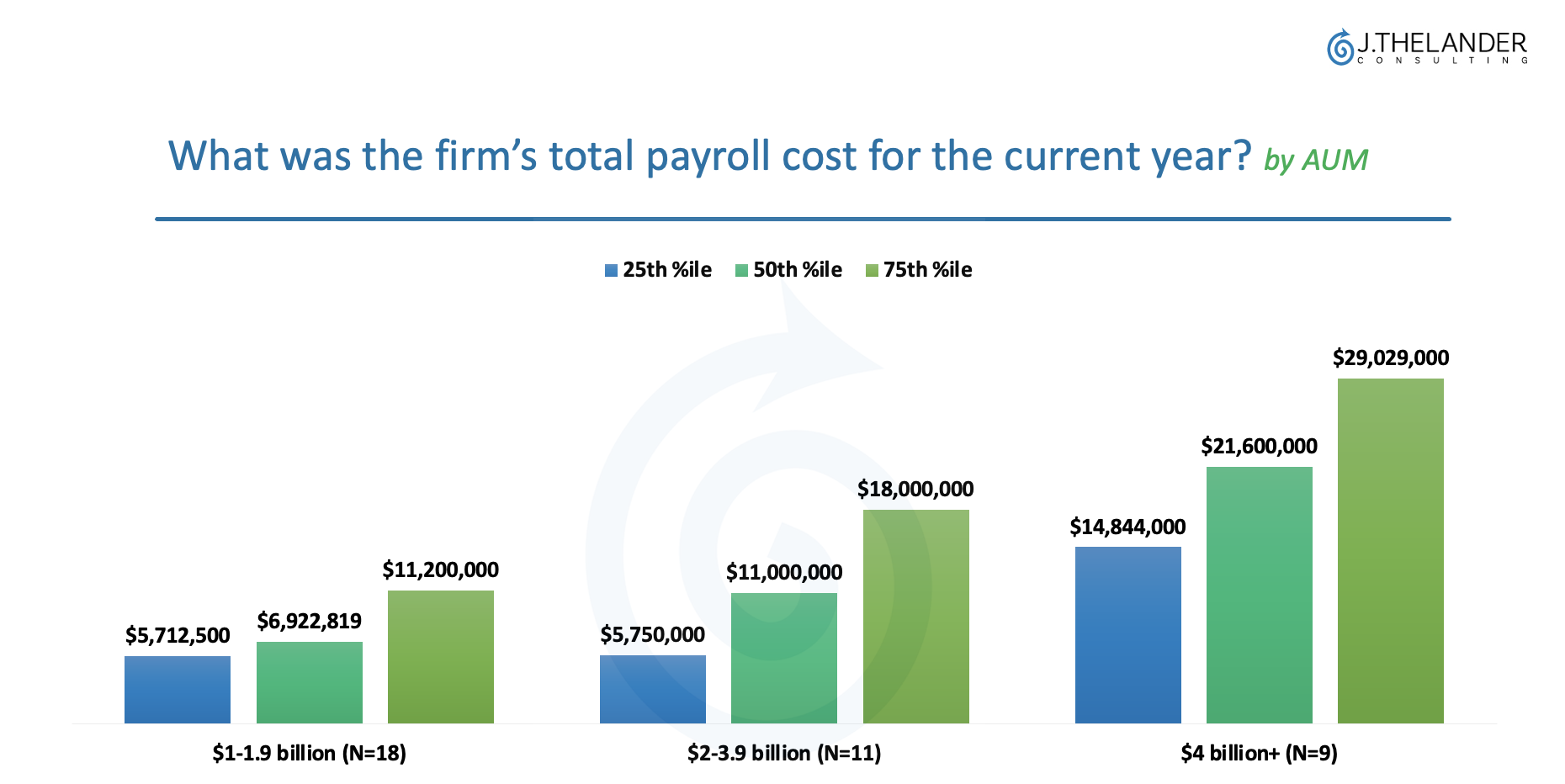 For firms with AUM between $1 and $2 billion, median payroll costs range from $5.7 million to $11.2 million. For firms with $2 billion to $3.9 billion, median payroll costs range from $5.75 million to $18 million. In general, the larger the firm, the higher the payroll cost.