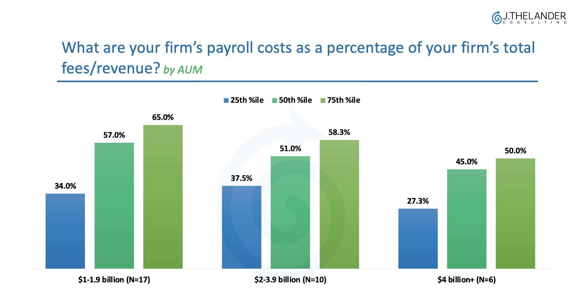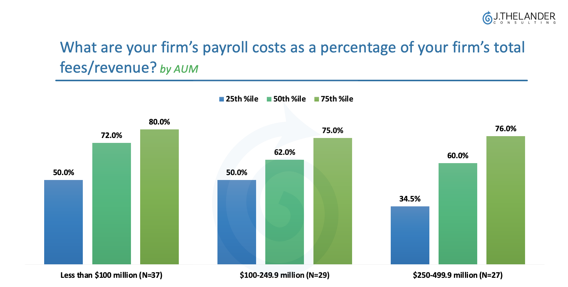 Firms in the 75th percentile with less than $100 million in AUM spend 80% of their total revenue on payroll and 50% at the 25th percentile.