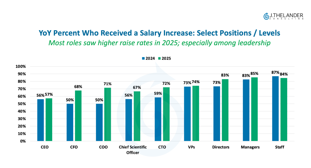 The percentage of those who received a salary increase for 2026 climbed significantly across leadership roles compared to “for 2025,” but not uniformly. Here’s where the action is: