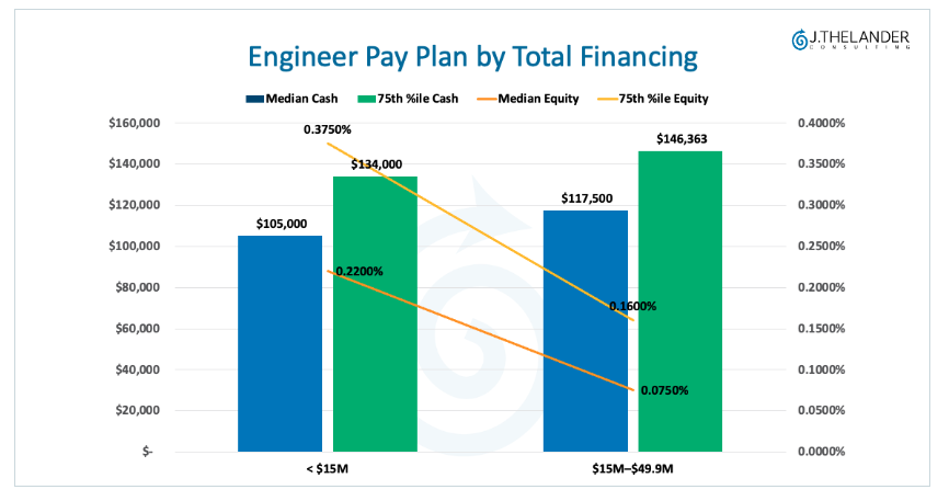 For example, let’s look at the Engineer Pay Plan and compare how the total cash and equity ranges shift as a company raises capital – from less than $15 million to $15 – $49.9 million in total financing.