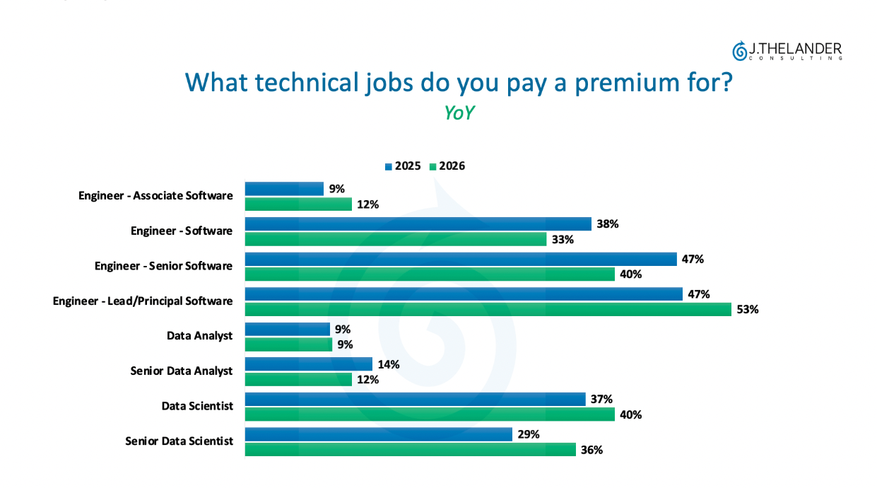 Lead/Principal Software Engineers are the most common role to receive a pay premium for their technical skills, and have increased by 6% from 2025 to 2026.