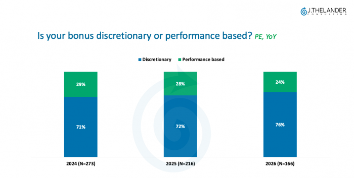 Private equity tells a different story. Discretionary bonuses were already more prevalent than in VC to start, at 71% in 2024, and have continued climbing — reaching 76% by 2026, while performance-based pay has correspondingly shrunk from 29% to just 24%.